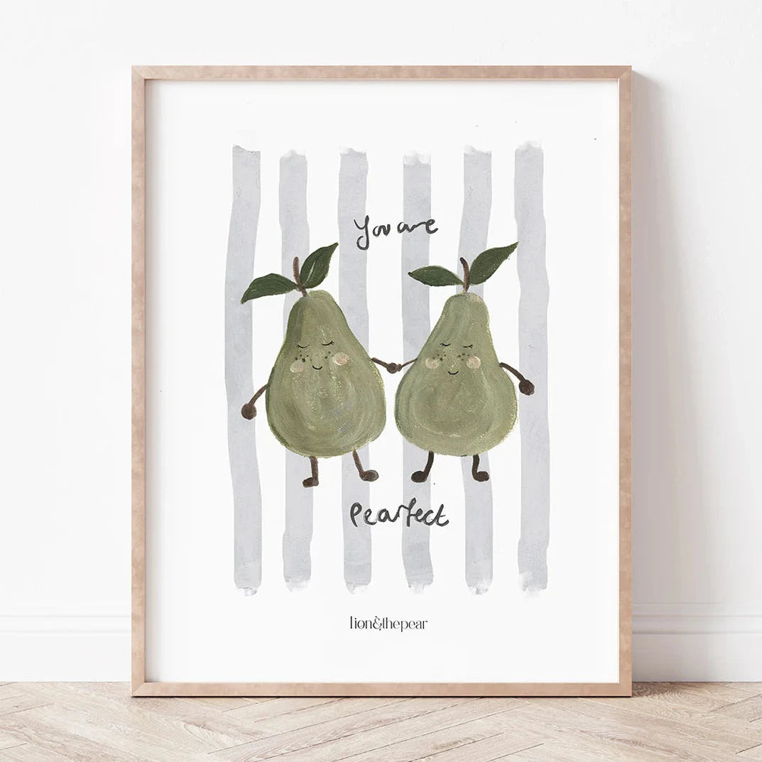 Hand-painted Pear Print, featuring two cute little pear characters. Let this delightful artwork inspire your child's space and bring a timeless essence to their walls.