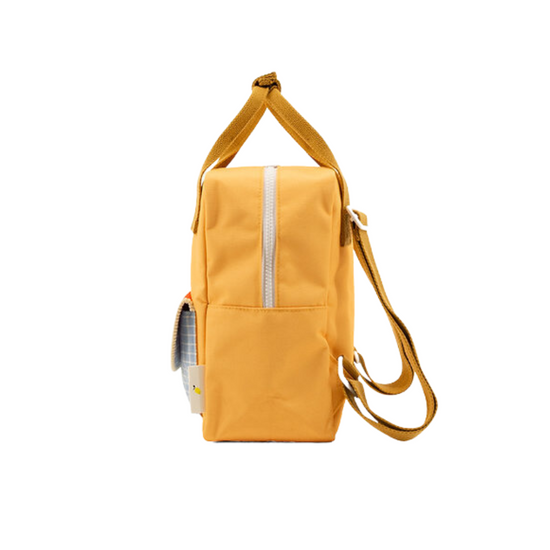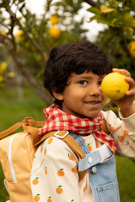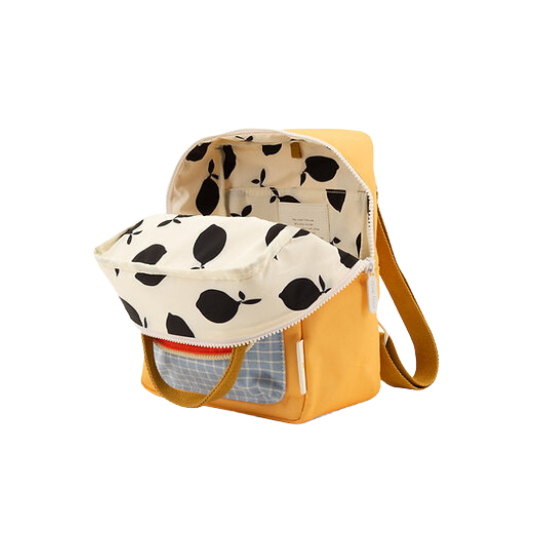 Yay! These small backpacks are made from recycled PET bottles. On the front you find an extra pocket. The lining is waterproof. The zippers are from YKK and the shoulder handles are adjustable. On the inside you'll find an elastic bottle holder and a pocket all over the back that closes with velcro. On the name tag you can write down your name and contact details. The inside has a lemon pattern.
