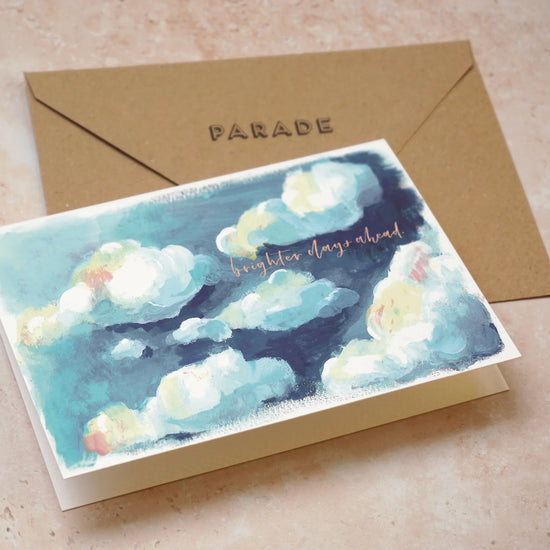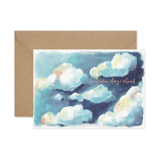 Illustrated sympathy and encouragement greeting card featuring blue sky design and hand lettering which reads: "Brighter Days Ahead".