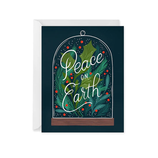 This hand lettered Holiday Card features a terrarium of sprigs of holly leaves, pine and berries, with a peaceful, heartfelt message.