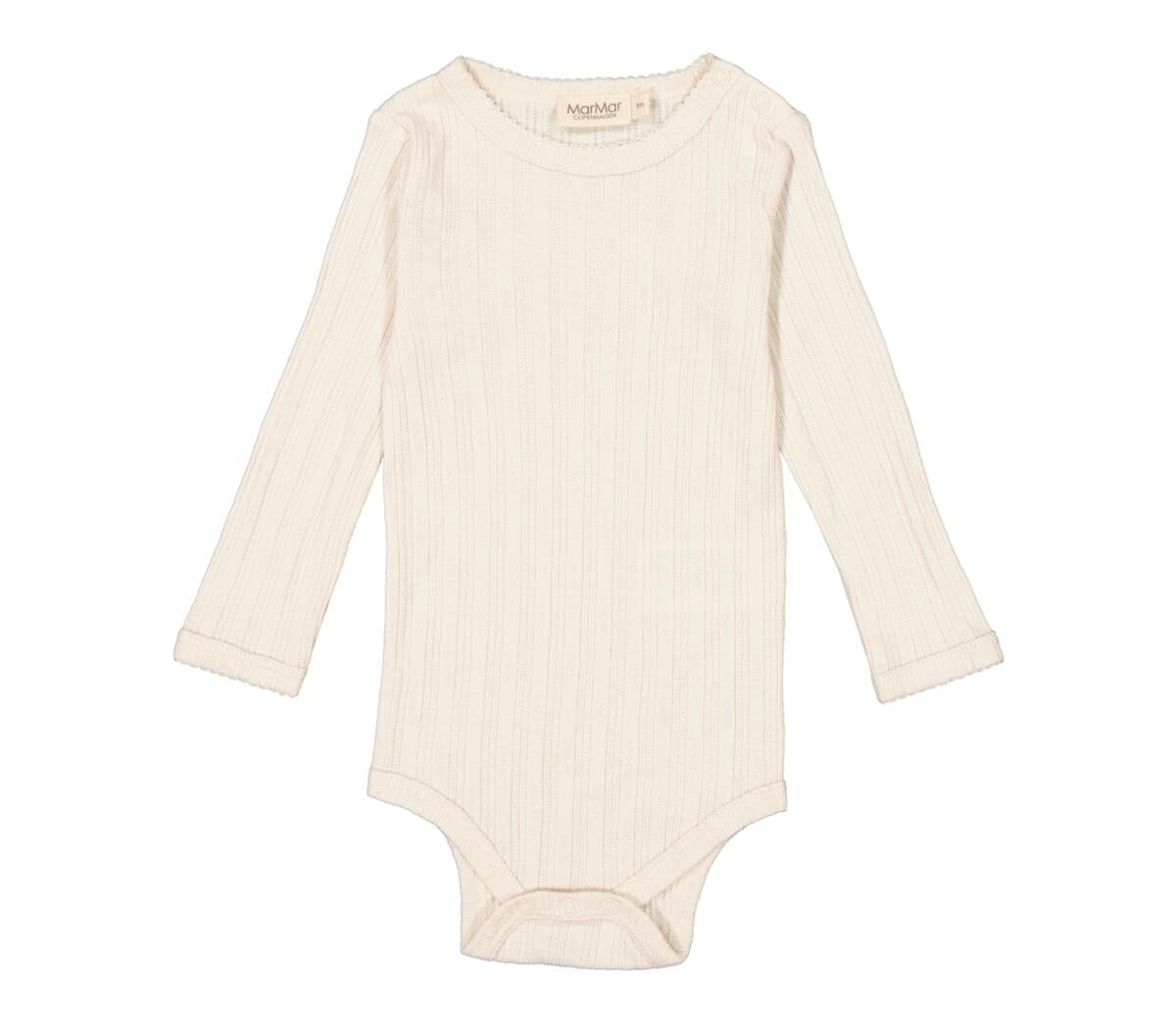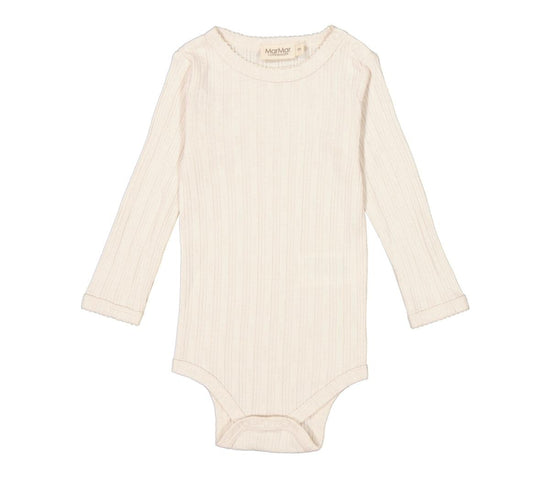 Plain long-sleeved bodysuit, with snap buttons on the left shoulder and at the leg for easy changing.