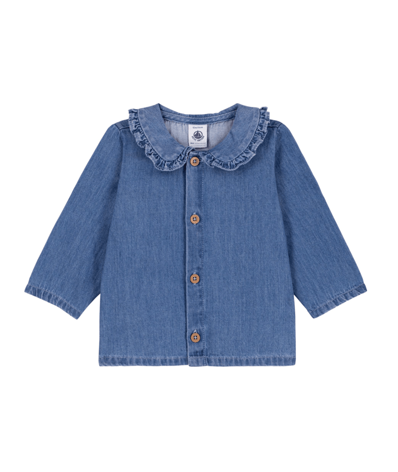 Refined with its pretty collar, this lightweight denim blouse will look darling on your little one! The poppers all the way down are very handy when you're getting your baby dressed.