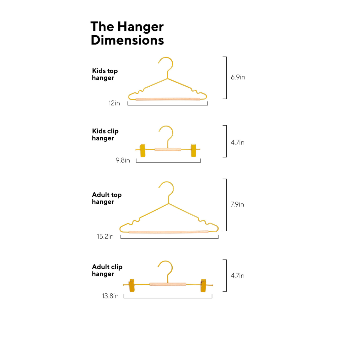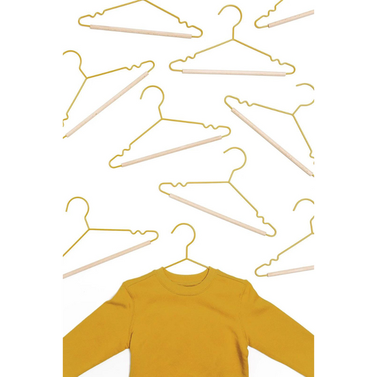 Say hello to the cutest hangers for your little people! Our fancy hangers have a smooth matte powder-coated finish, a wooden detail and a mustard signature 'squiggle' on the sides for added cool factor. These adorable mini hangers will fit clothes from teeny baby size all the way up to age ten.