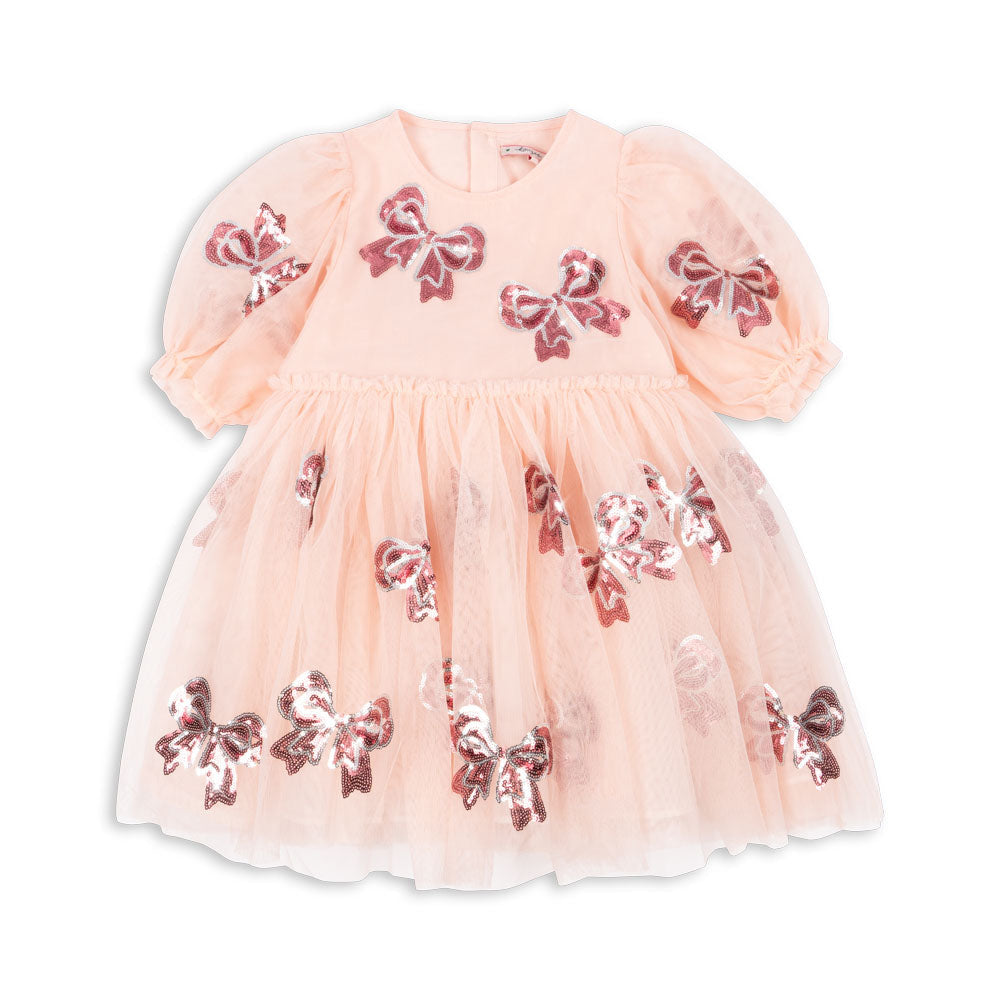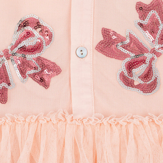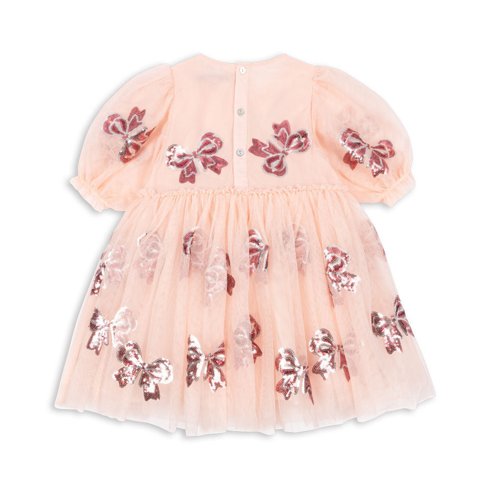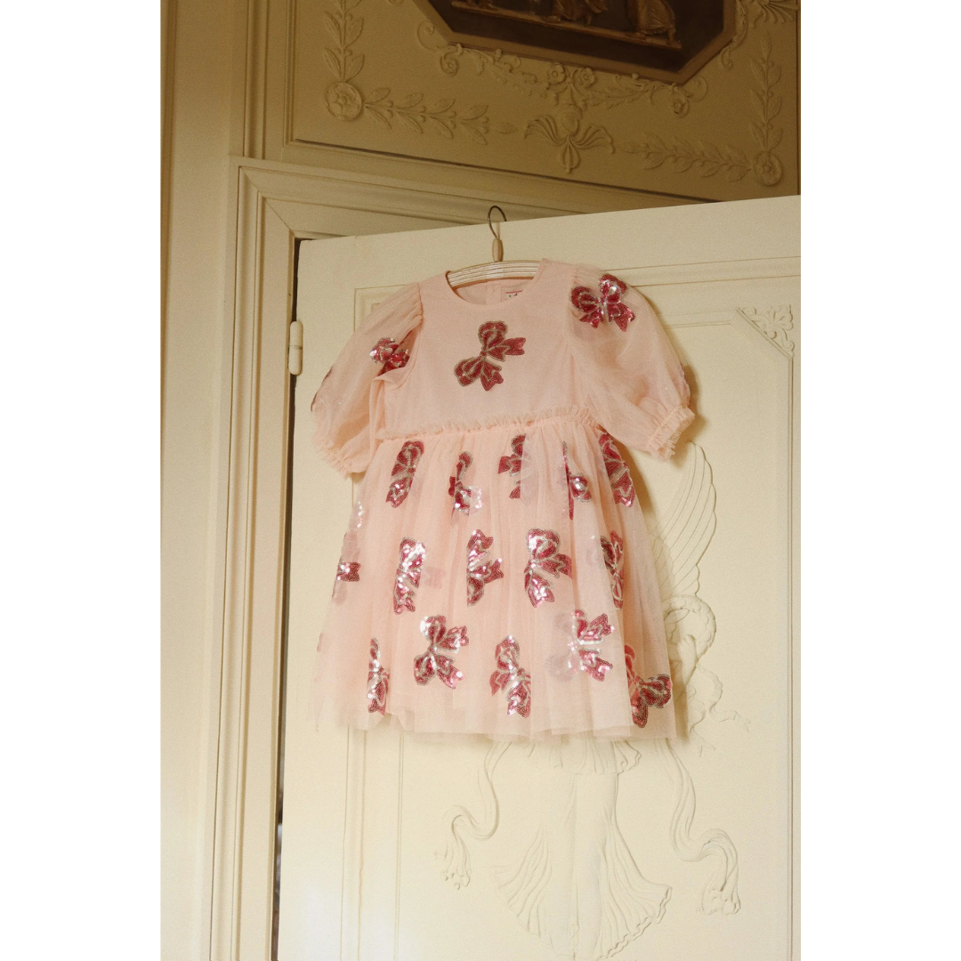 Voluminous tulle dress with short puff sleeves. Designed with a band that goes around the waist. Adorned with sequin embroidery.