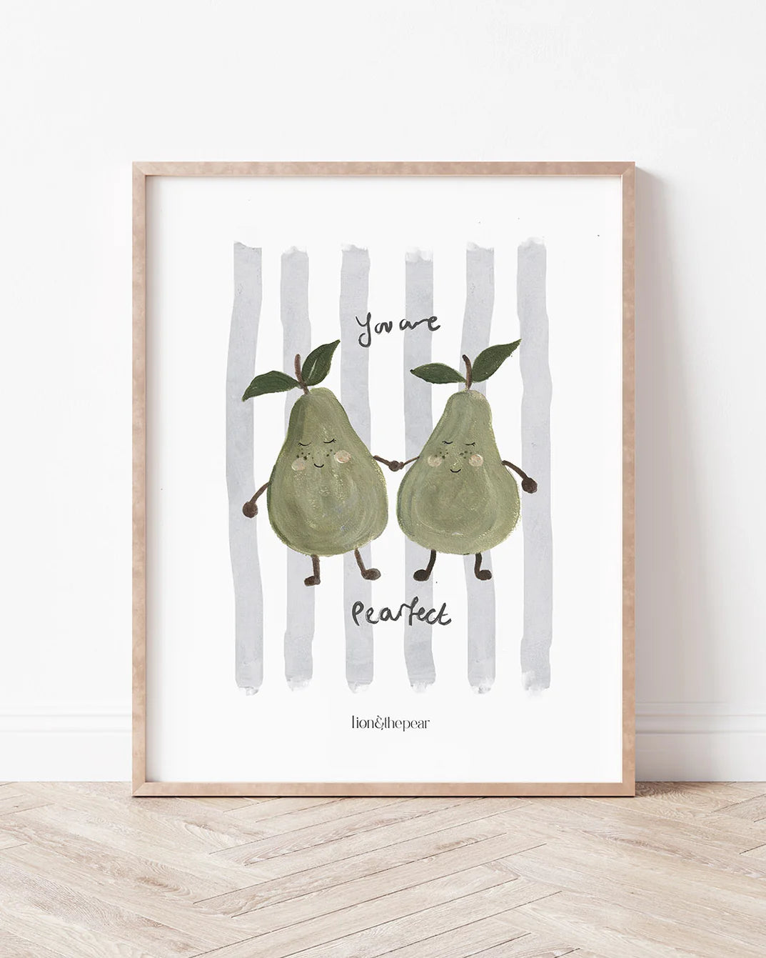 Hand-painted Pear Print, featuring two cute little pear characters. Let this delightful artwork inspire your child's space and bring a timeless essence to their walls.