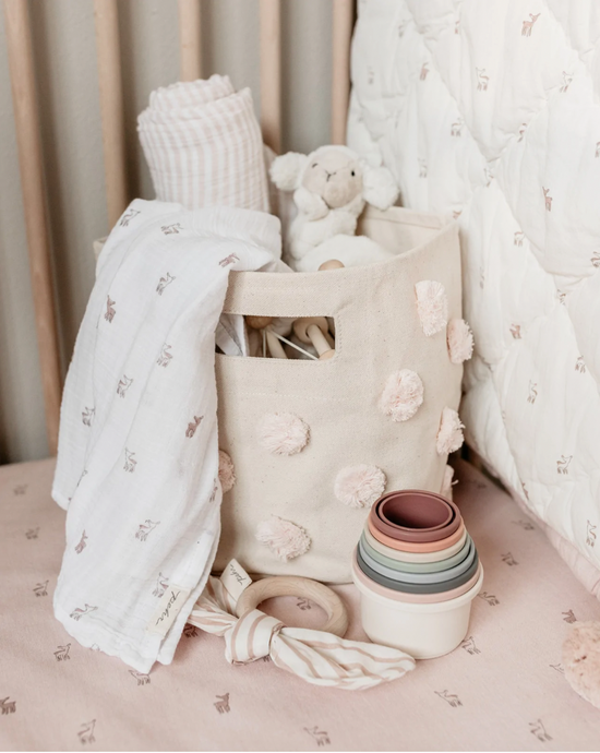 Declutter and update your decor with this durable cotton-canvas storage pint that is perfect for diapers, creams and other small stuff! With each Pom Pom sewn by hand, it will add a pop of playfulness to any room.