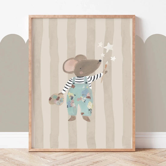 Hand-Painted Artist Mouse, painted in Acrylic paint onto a stripey neutral background.