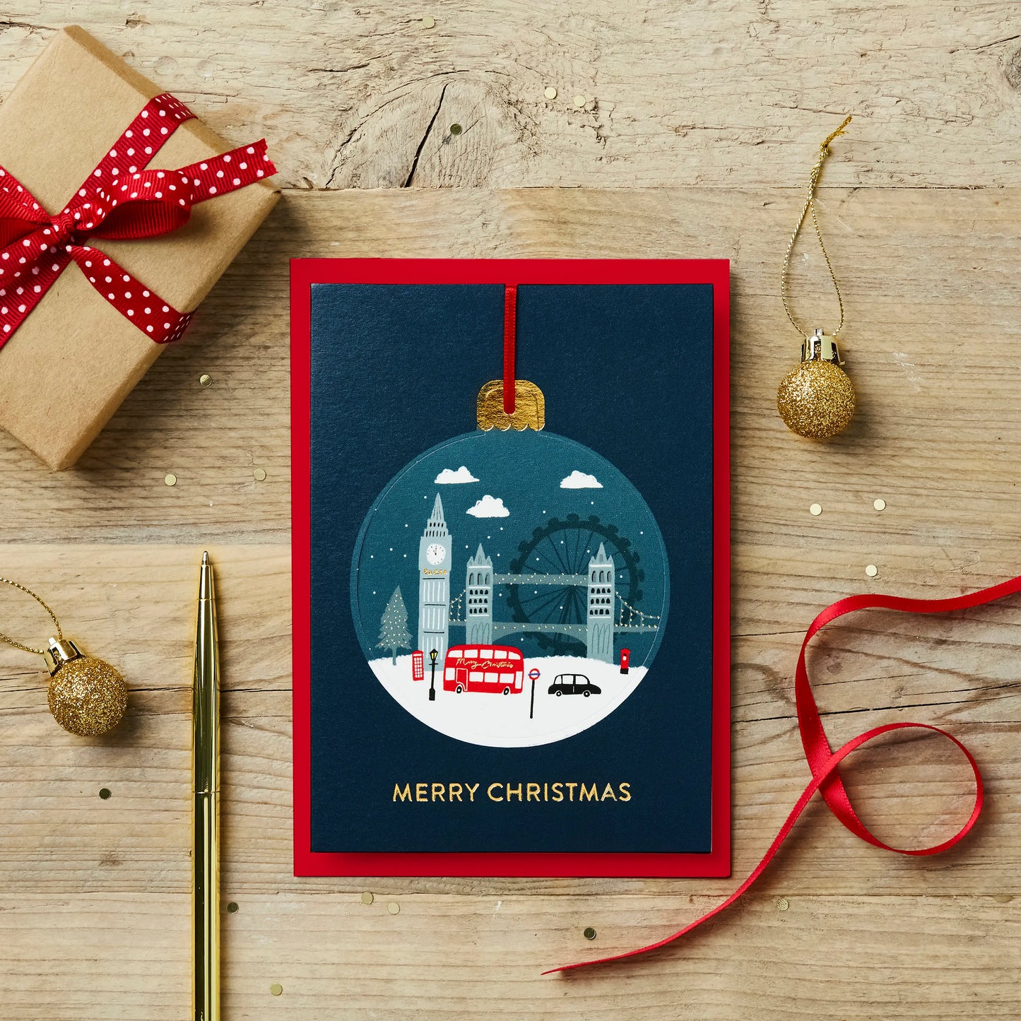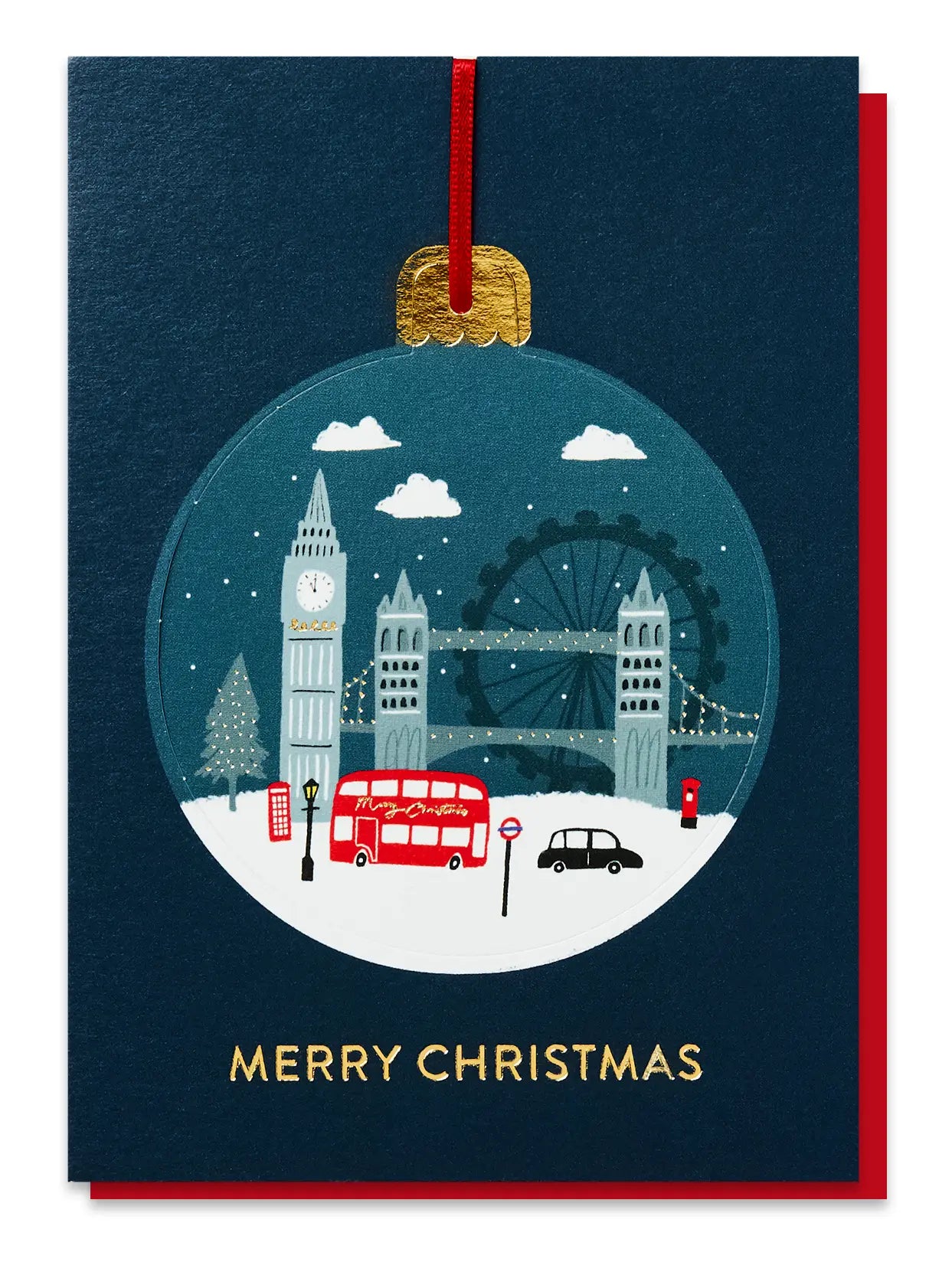 Sending cheery Christmas greetings from London! This extra special card includes a paper ornament that the recipient can pop-out and hang on their tree for years to come! Finished with gold foil and satin ribbon.