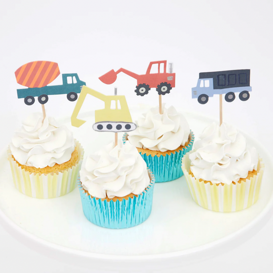 • The kit includes 24 toppers with 4 designs of construction vehicles, with lots of shiny silver holographic foil