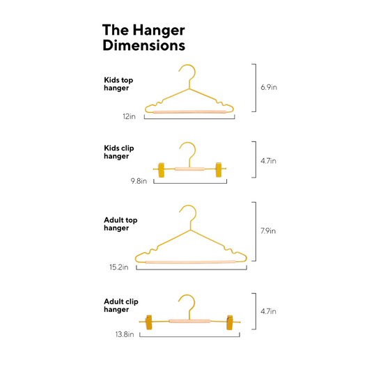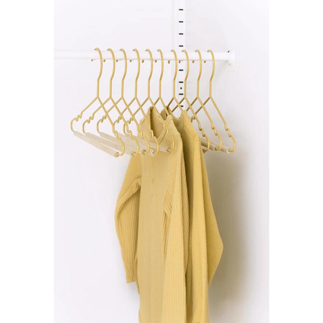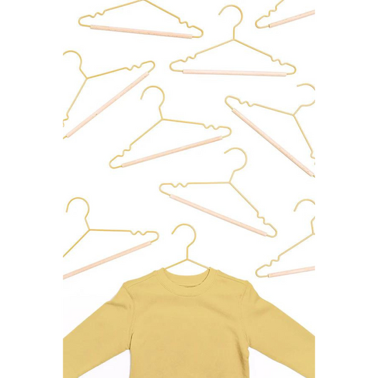 Say hello to the cutest hangers for your little people! Our fancy hangers have a smooth matte powder-coated finish, a wooden detail and a mustard signature 'squiggle' on the sides for added cool factor. These adorable mini hangers will fit clothes from teeny baby size all the way up to age ten.