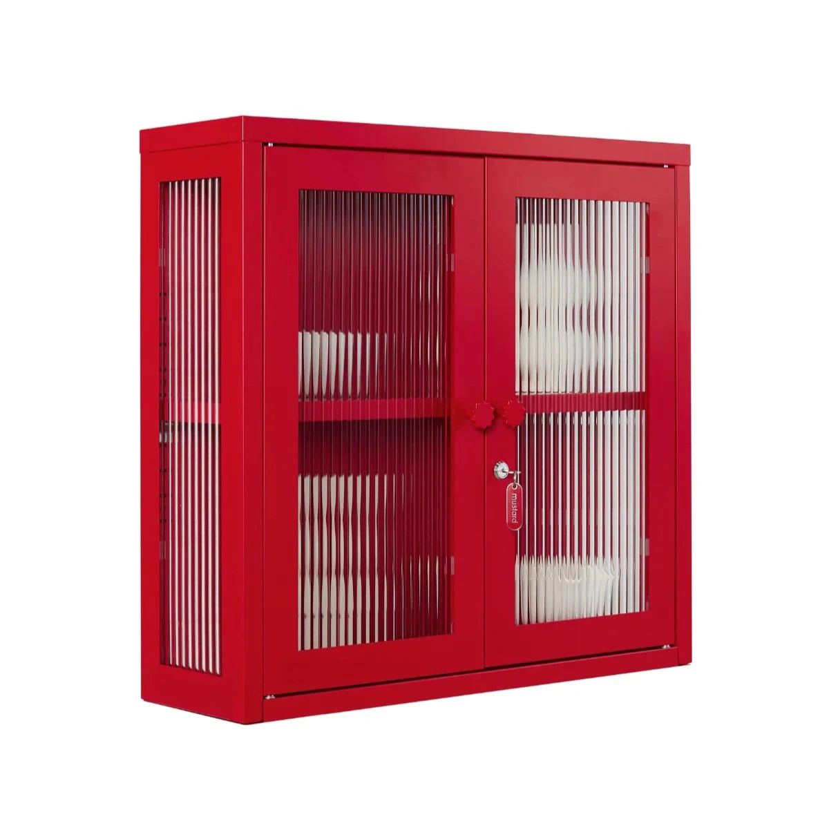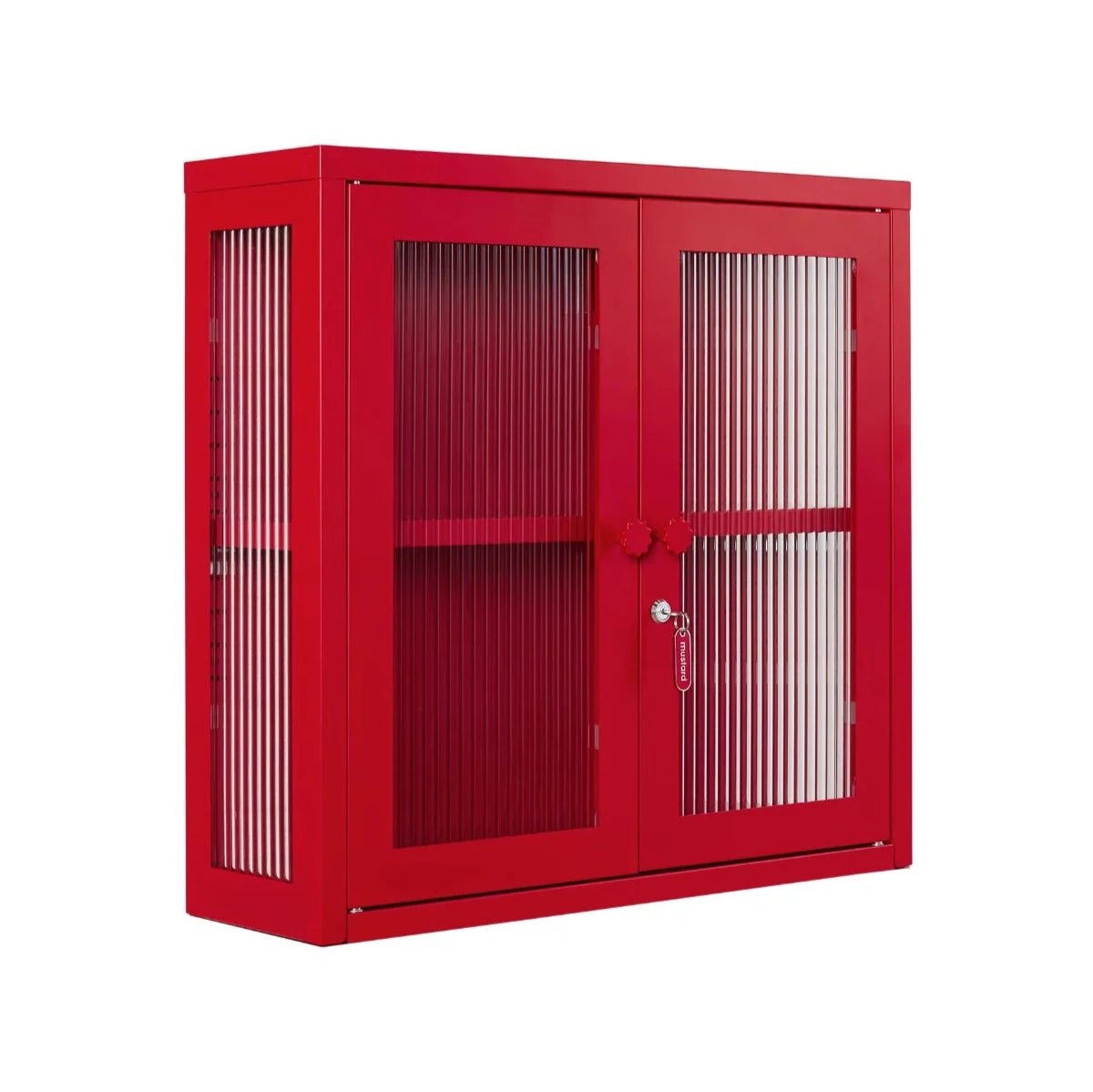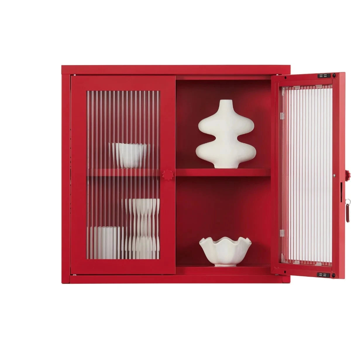 • Inside: An adjustable shelf, lockable doors and fluted glass panels set in a metal frame