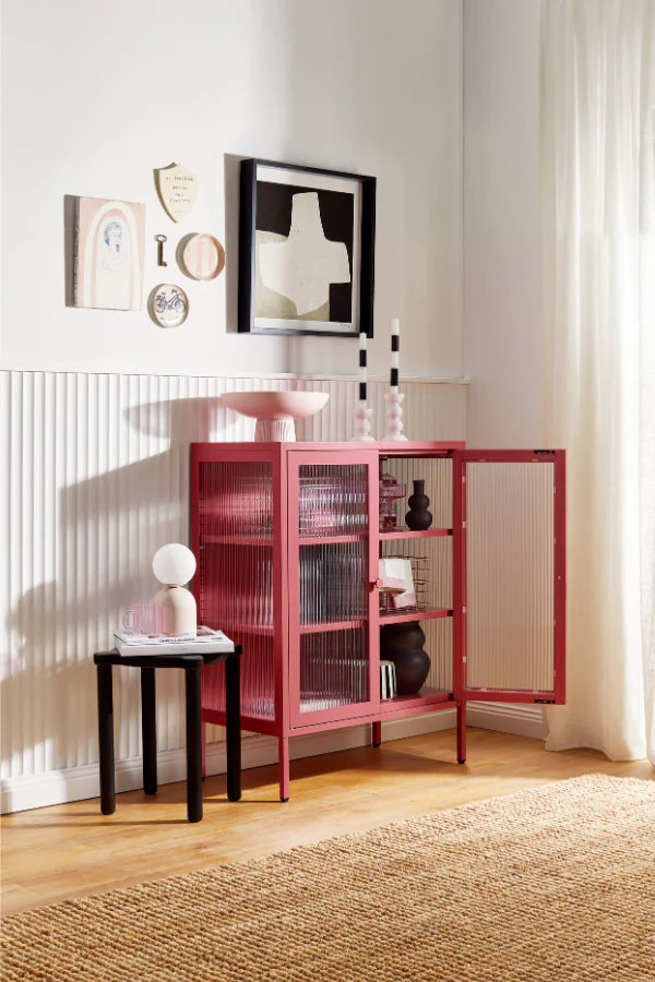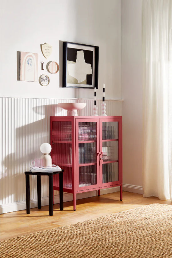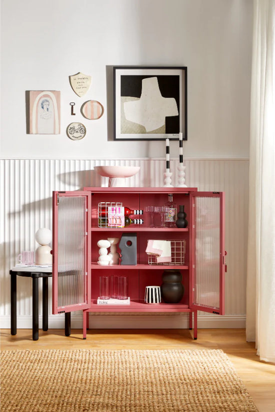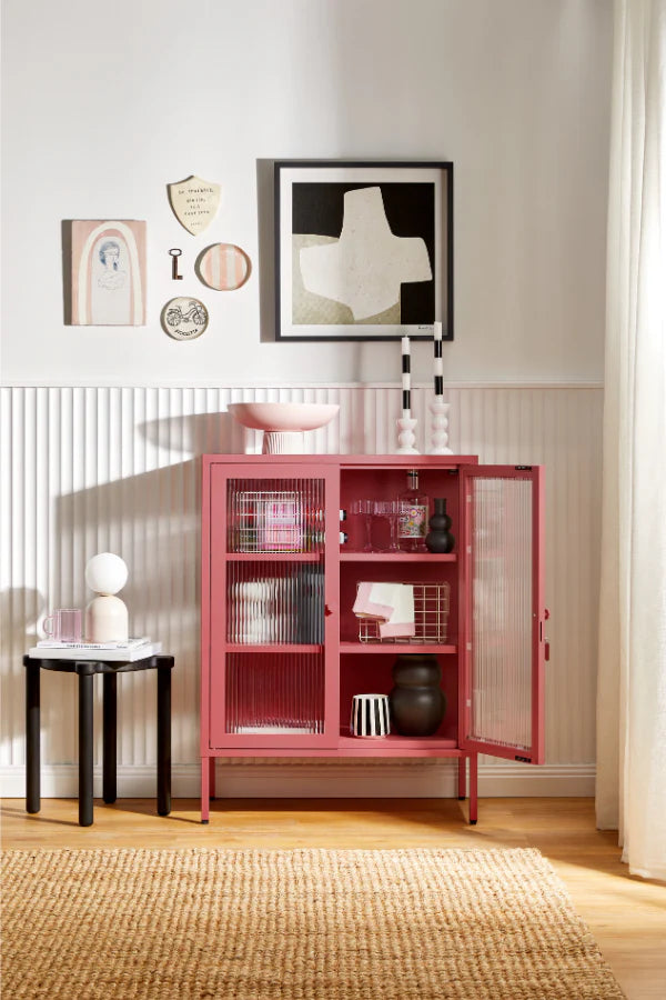 You can have nice things (and see them too!) When your favorite pieces are too beautiful to be hidden away, The Mixer is here to put them on display. She makes the perfect drinks cabinet, kitchen buffet or sideboard, with fluted glass to leave a little to the imagination. Medallion handles, a custom enamel keyring and adjustable feet make her the perfect mix of pretty and practical.